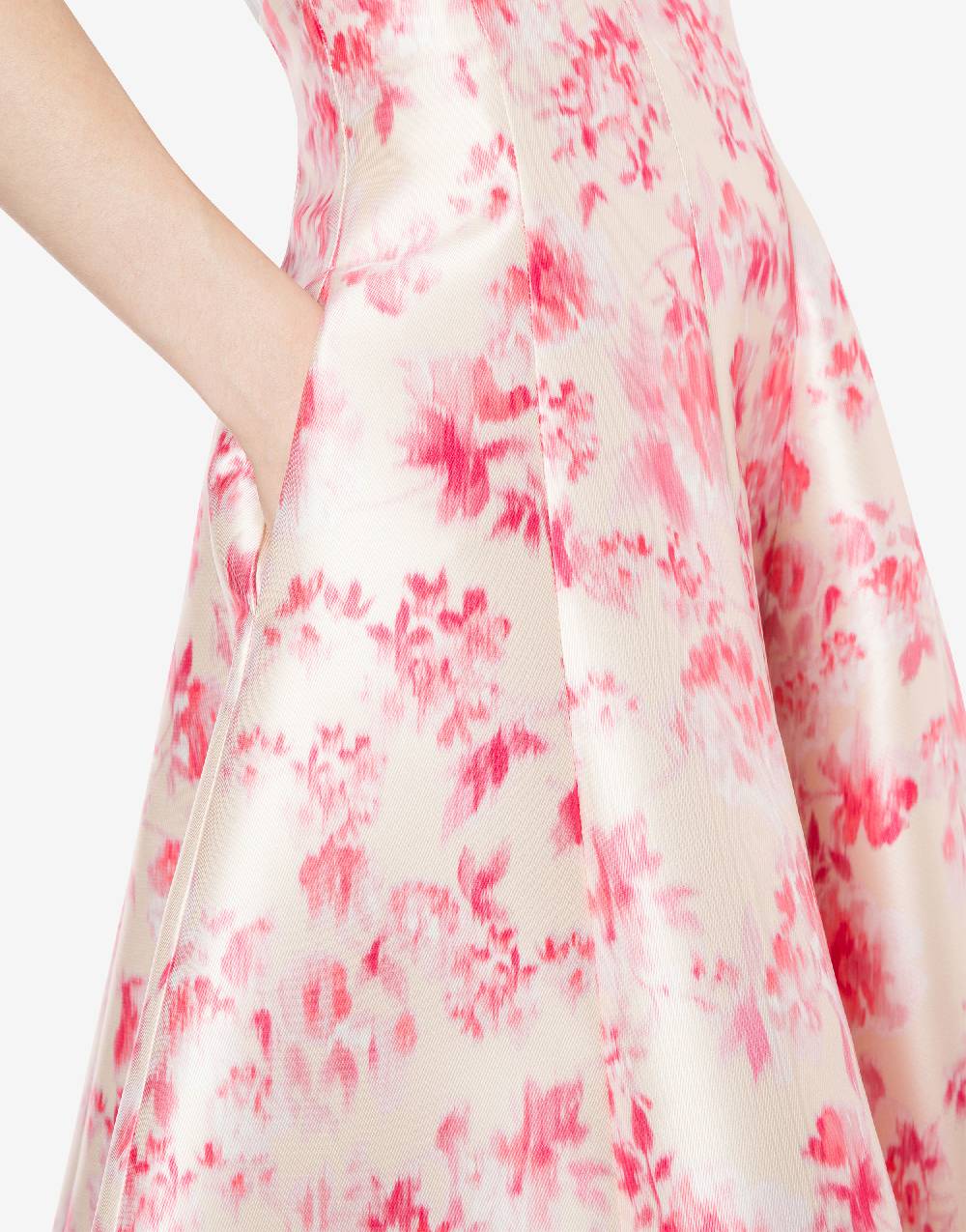 Gonna longuette a vita alta in lucente radzmir con stampa fiori effetto acquarello degradé. La linea svasata richiama le silhouette a ruota anni '50.
