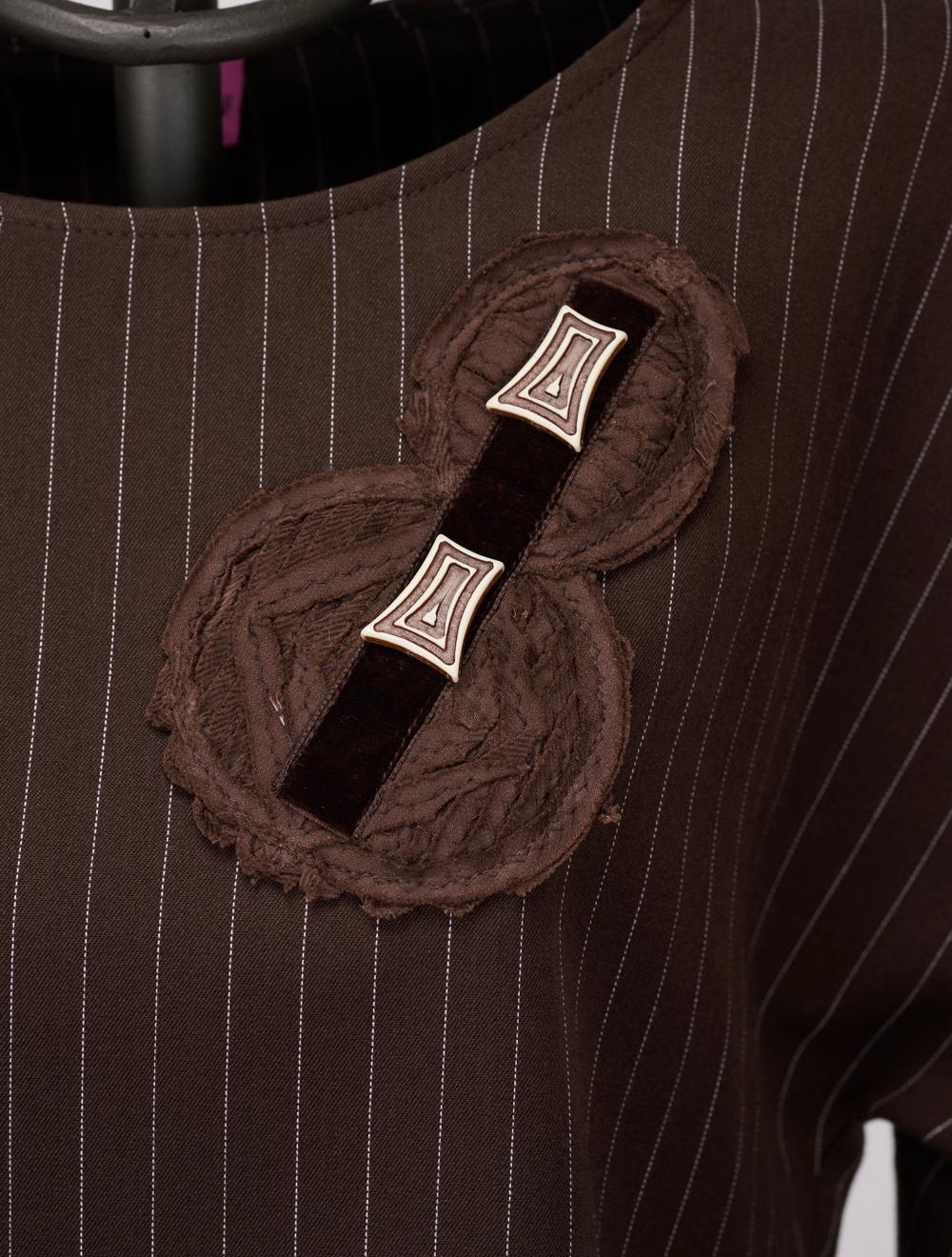 n’elegante blusa marrone in tessuto gessato, manica finto chimono, scollo tondo. Applicazione con ricamo tessile, velluto e elementi in PVC. Piccoli spacchi sui fianchi.
