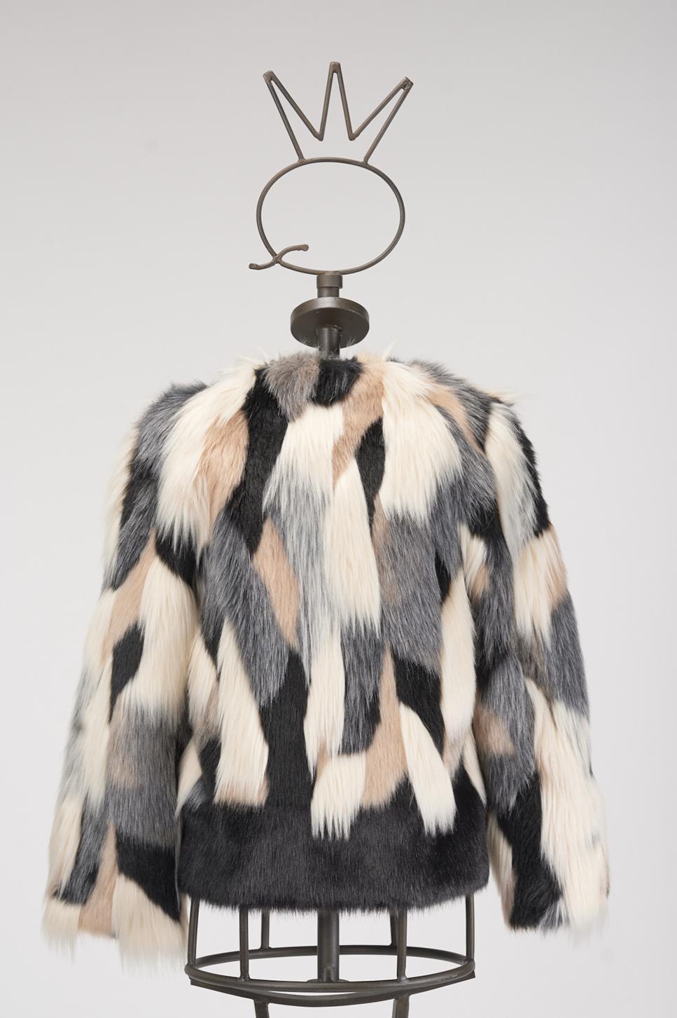 Una ecopelliccia a pelo medio di colore grigio, panna beige e nero. Senza collo. Si chiude con dei ganci.