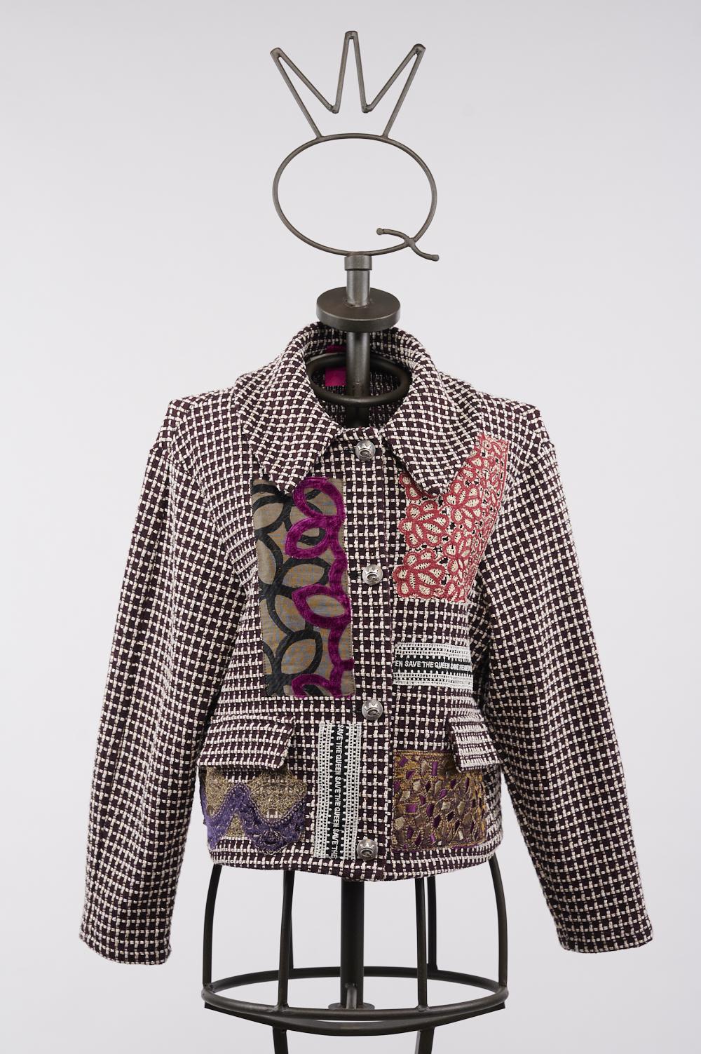 Un giacchino corto in cotone a quadri nei toni del bordeaux e panna. Leggermente scollato con colletto. Si chiude con quattro bottoni personalizzati con corona. Sul davanti sono applicati tessuti ricamati, pizzi e passamanerie.