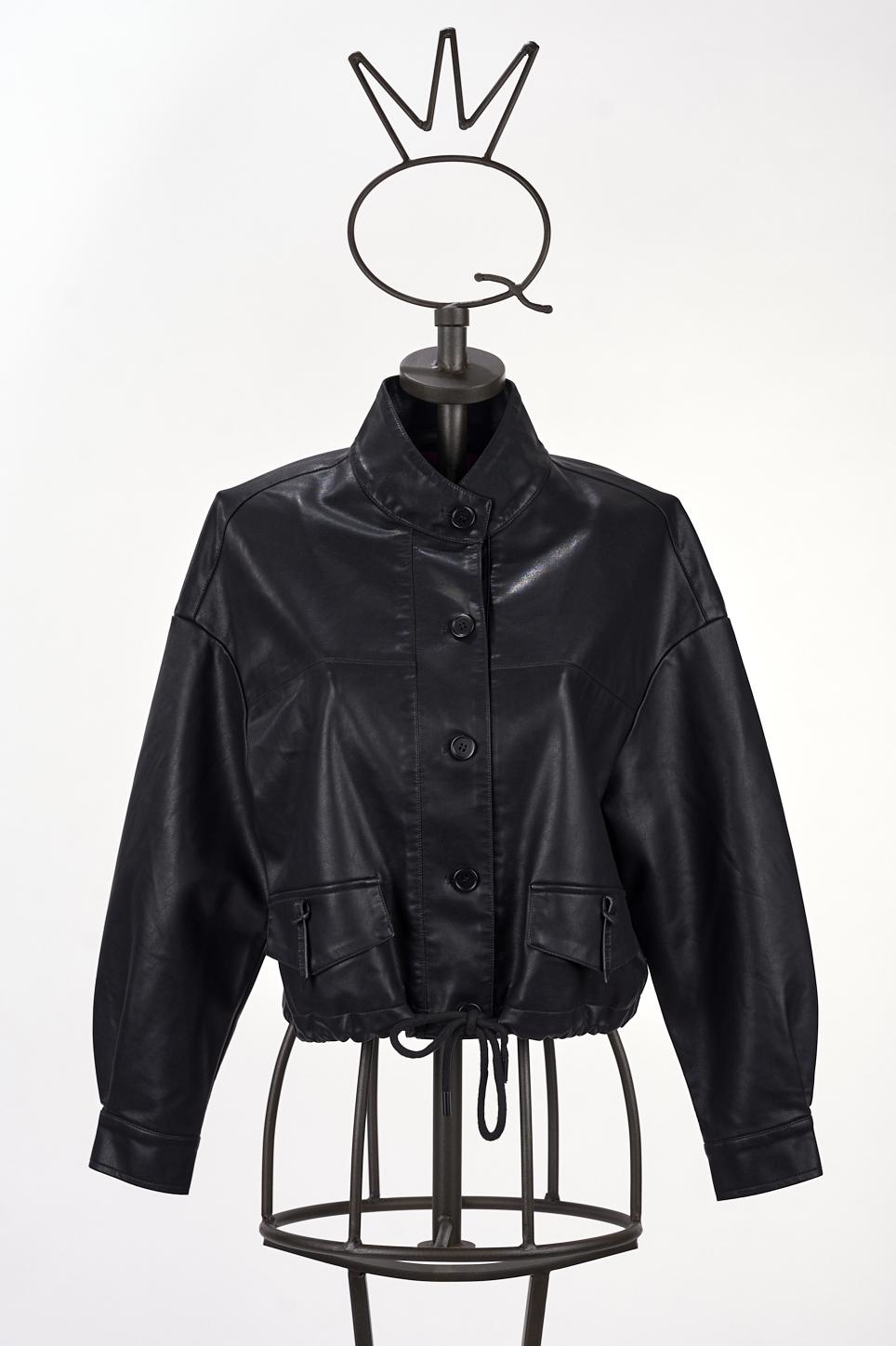 Un giubbotto corto in ecopelle nera con maniche a pipistrello. Si chiude con quattro bottoni ed ha due tasche. Ha una coulisse per evidenziare il punto vita. Sul dietro bellissima applicazione ricamata.