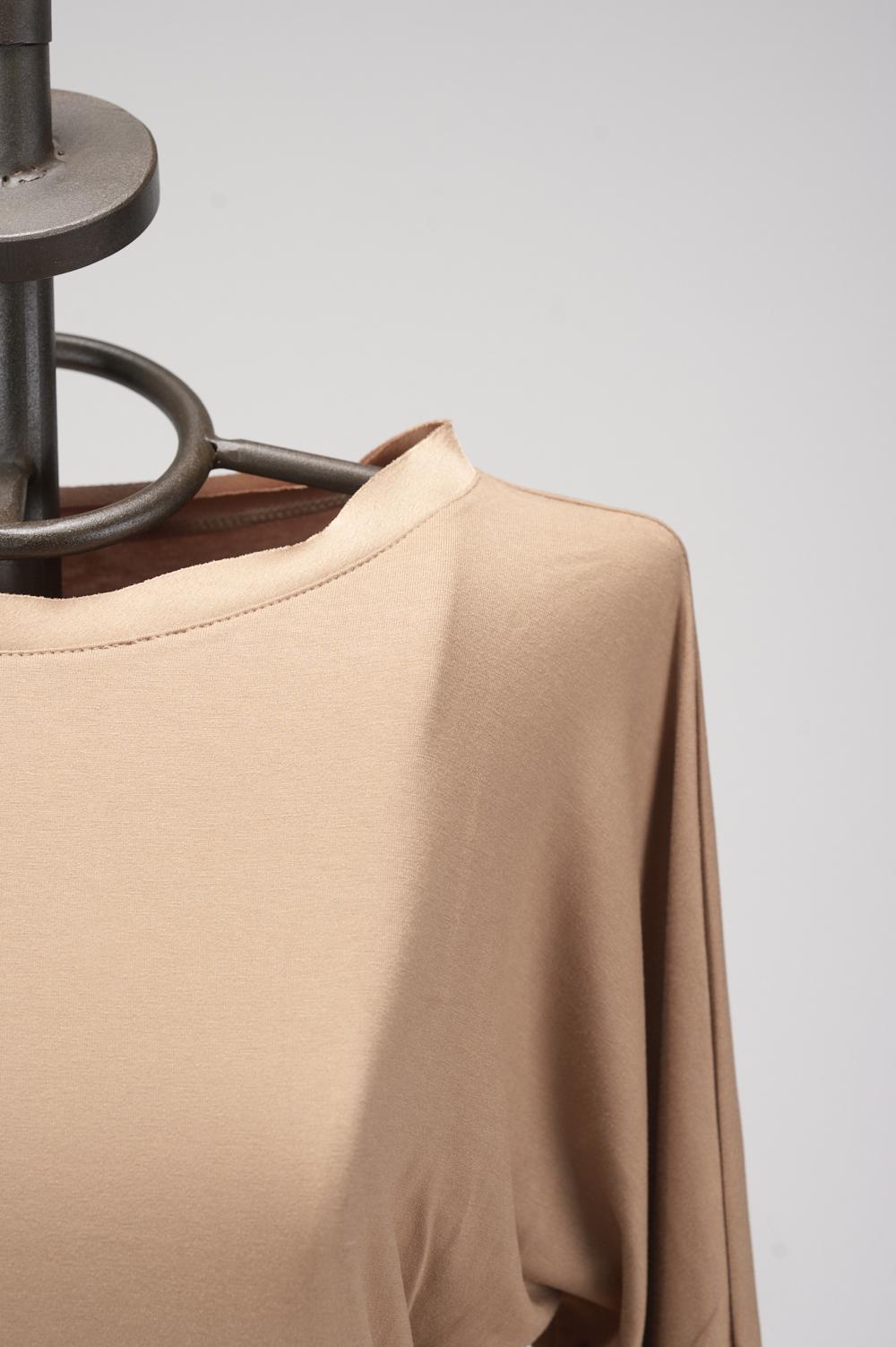 Una t-shirt beige con collo e polsi in raso nella solita nuance. Maniche a tre quarti a pipistrello.